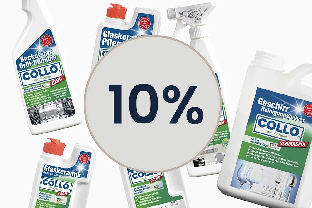 Entdecke eine vielfältige Auswahl an hochwertigen Reinigungsmitteln bei COLLO. Dein Zuhause verdient das Beste, wenn es um Sauberkeit geht. Mit COLLO erlebst Du Reinigungsmittel, die nicht nur effektiv sind, sondern auch deine Reinigungsaufgaben spielend einfach machen. Stelle dir vor, wie hartnäckiger Schmutz und Fett mühelos verschwinden, und Ihre Oberflächen in neuem Glanz erstrahlen. Unsere Kollektion von Kochfeldreinigern, Fettlösern und Backofenreinigern setzt neue Maßstäbe in der Reinigungsleistung. Deine Zeit ist kostbar – gönne dir die Leichtigkeit der Reinigung mit COLLO.